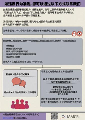 如果您遭遇或目睹骚扰行为,请勇敢发声。您可以联系保密联络人(CCP)(联系方式见下方),或向部门/工作组负责人、国际理事会成员寻求帮助。您有权要求在进一步举报时保持匿名。